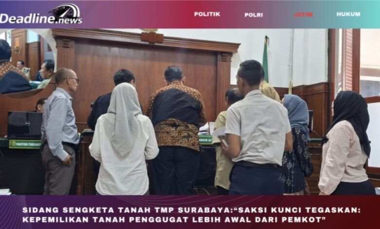 Surabaya , Deadline.News– Sidang lanjutan perkara perdata Nomor 1181/Pdt.G/2025/PN Sby di Pengadilan Negeri Surabaya kembali mengungkap fakta baru dalam sengketa lahan di belakang Taman Makam Pahlawan Sepuluh November. Agenda persidangan kali ini menghadirkan saksi dari pihak penggugat, yakni mantan petugas ukur BPN dan mantan lurah Dukuh Pakis.
